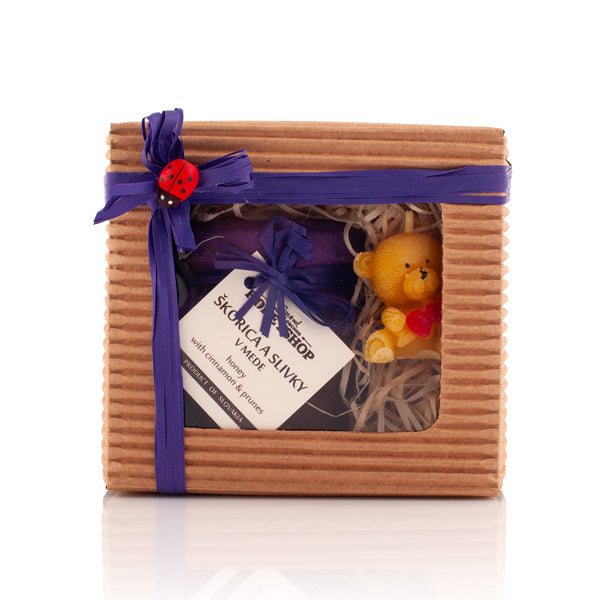 Vo vnútri krabičky nájdete našu ručne odlievanú sviečku zo 100% včelieho vosku, ktorá zanecháva pri horení príjemnú a jemnú vôňu. Jej plameň prinesie do vašej domácnosti teplú atmosféru a prírodný kúsok našej rodinnej tradície. Druhou súčasťou je naša vlastná škoricovo-slivková mňamka. Ide o náš krémový repkový med, ktorý je jedinečný svojou konzistenciou a jemnou chuťou. K nemu sme pridali štipku škorice a sušené slivky, ktoré spolu vytvárajú nezameniteľnú chuťovú kombináciu.