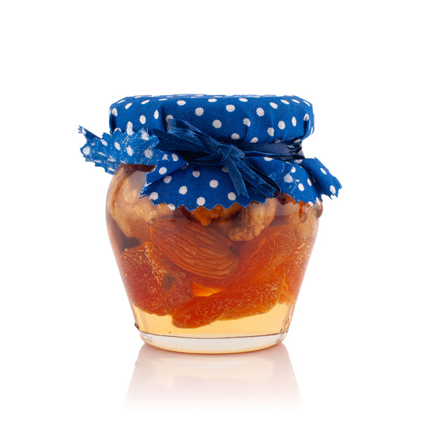 ZLOŽENIE: agátový med, sušené marhule (marhule, konzervant: oxid siričitý) 12%, mandle 8%, vlašské orechy 8%